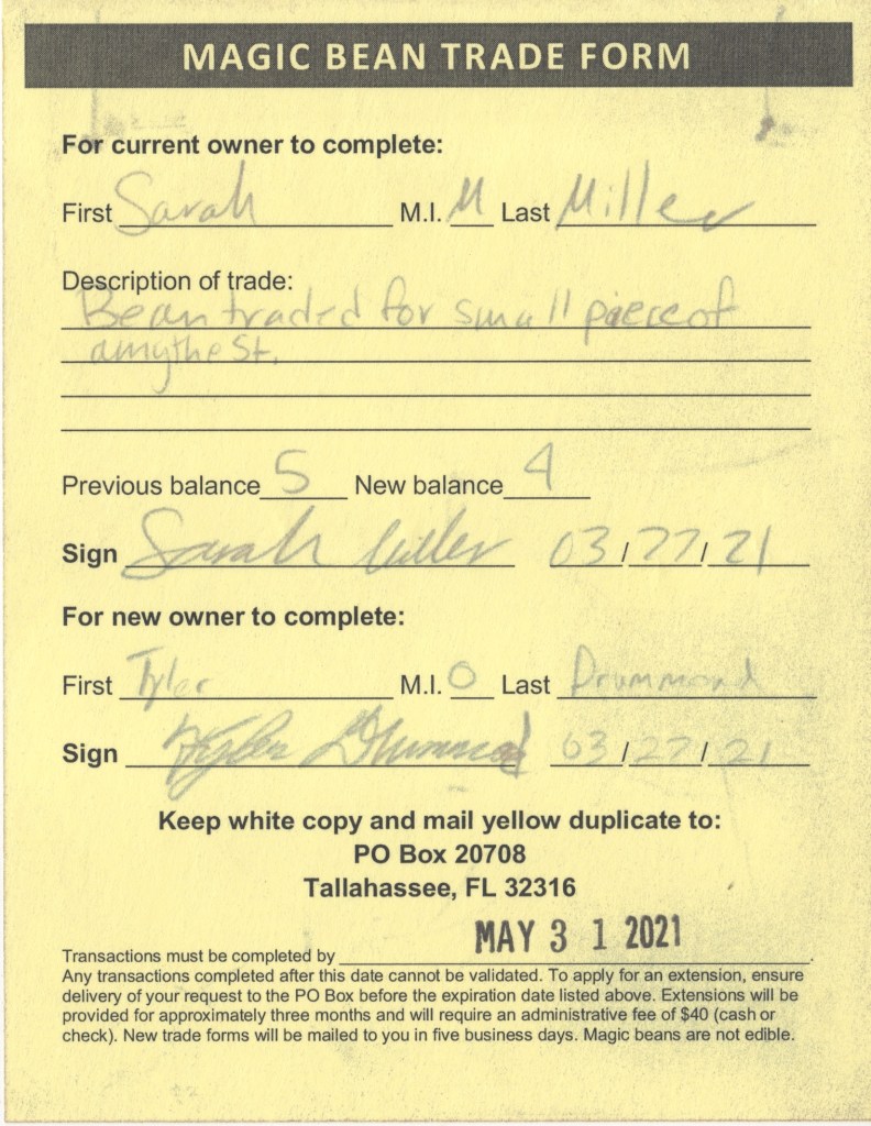 The yellow trade form that I receive is the only direct benefit that receive from this project. They are the artwork that I will exhibit along with newly minted magic bean trading kits available for purchase or exchange. The yellow forms are only a carbon duplicate of the original. In my opinion, this places the bulk of rewards with the participant of this project. As a reward they retain the rights to the original copy of their trade document and the material good with which it is associated with. Any transactions that I complete myself are only meant to be useful as examples. In my opinion, the true value comes from the frequency of the genuine interactions by my collaborators.