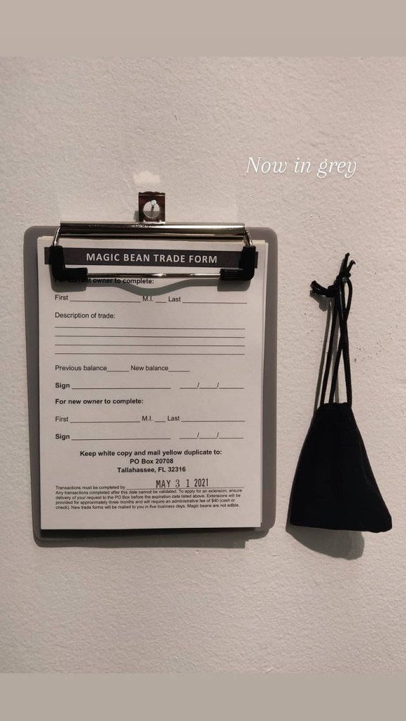 As the originator of the magic bean castings and the trade forms, I feel that the project gains traction only through the velocity and persistence of exchange. I have utilized my closest friends and colleagues to help me get the magic beans into circulation. It is my hope that they may attain a common value.