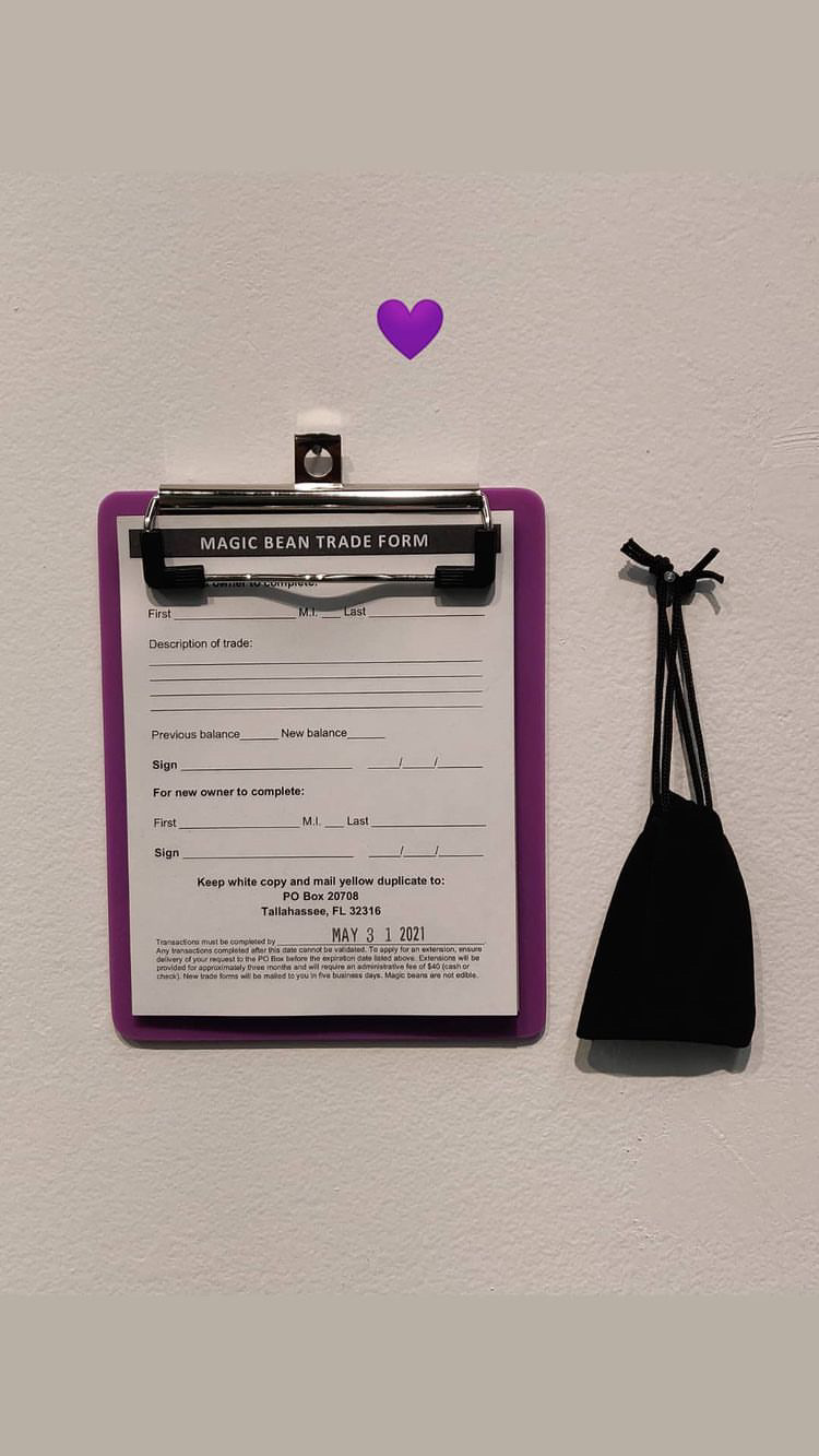 For each bean I make a two-part transaction form goes with it. Anytime the bean(s) are exchanged for another commodity, a trade form must be completed to authenticate the transaction. Provenance is established by mailing the the form to my PO Box. I then catalogue these trades and exhibit them as artworks.